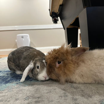 Chewy and Lillibet are a bonded pair and must be adopted together. These bunnies were dumped in a carrier at an emergency vet one night without a word. A staff member found them. Chewy is an angora and he was very matted and weighed down with fur due to poor care. Chewy was shaved and seemed so relieved to see that matted mess go! Lilibet was scared and needed nail trim and other basic care. They were so scared at the time that it was difficult to tell if they were bonded, but after time at their Hoppy Hearts SC foster home, it became evident that they were.